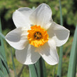 Flower Record Daffodil has masses of beautiful lightly-scented white trumpet-shaped flowers with yellow throats and orange edges at the ends of the stems in mid spring, which are most effective when planted in groupings. The flowers are excellent for cutting. Its grassy leaves remain dark green in colour throughout the season.
