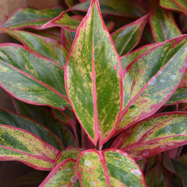 Siam Aurora Chinese Evergreen's attractive pointy leaves remain green in colour with distinctive red veins and tinges of chartreuse throughout the year on a plant with an upright spreading habit of growth.
